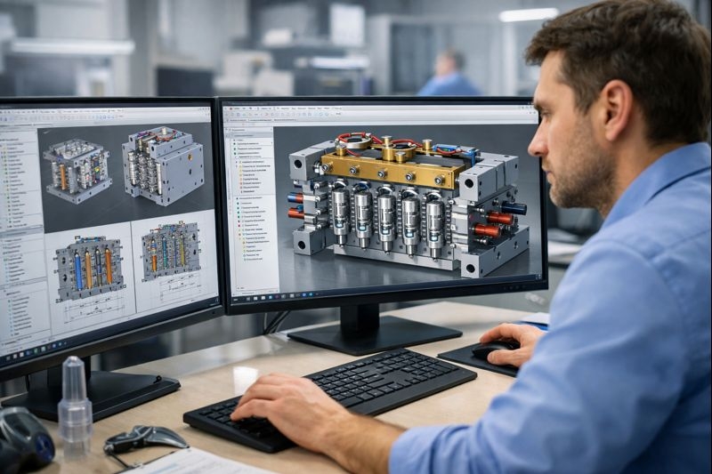 В 2026 году проектирование ведётся преимущественно в CAD/CAM-системах пятого поколения — Siemens NX, CATIA, SolidWorks, T-Flex. Используются модули анализа течения расплава (Moldflow, Moldex3D), которые позволяют моделировать процесс впрыска и отследить потенциальные «мертвые зоны» ещё до изготовления.